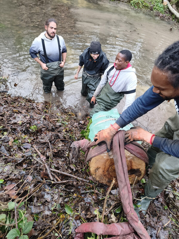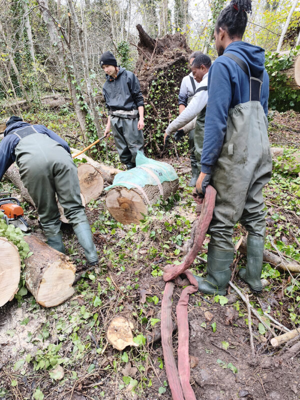 Grâce aux sapies, sangles et à la solidarité de tous, l’équipe est parvenue à traîner puis porter le tronc pour lui faire traverser la rivière en sécurité. Une véritable démonstration de cohésion et d’organisation collective.