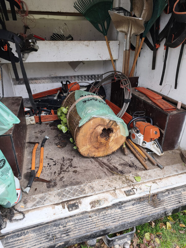 Le tronc, très lourd et instable, devait être maintenu en position pour garder l’ouverture vers le haut et éviter que l’essaim ne soit retourné.